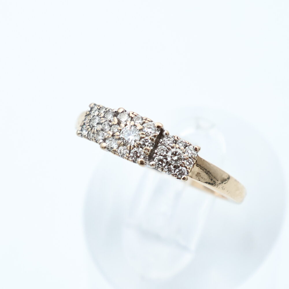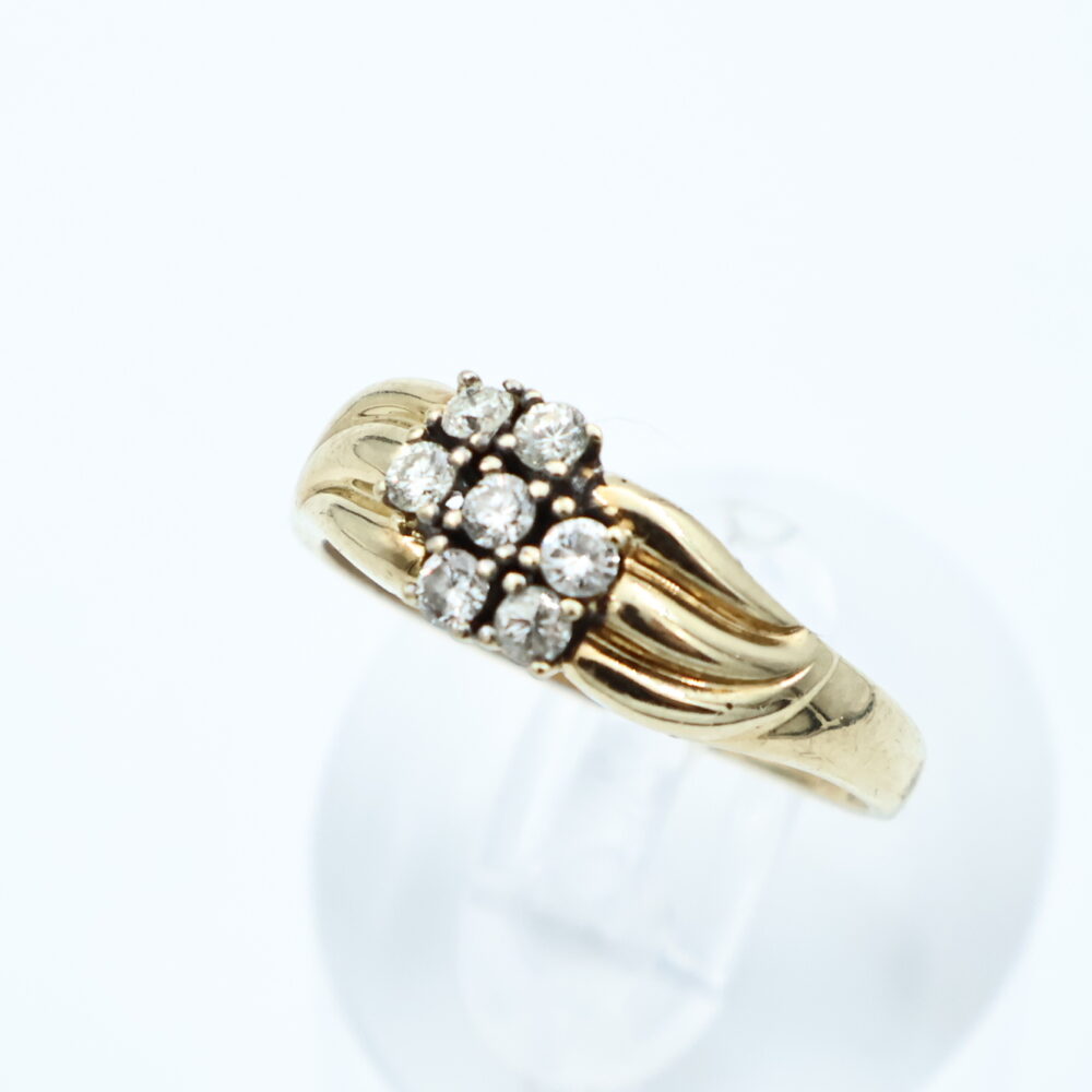 Ring i gult gull med diamanter 14kt gull totalvekt 2.9 gram størrelse 57.5 estimert 0.24ct fordelt på 7 stk diamanter