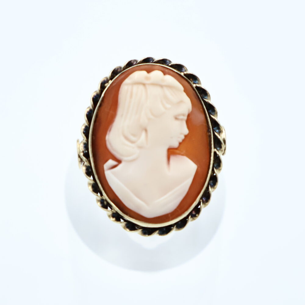 Ring i gult gull med came 14kt gult gull største breddemål 22.6 mm totalvekt 4.1 gram størrelse 57