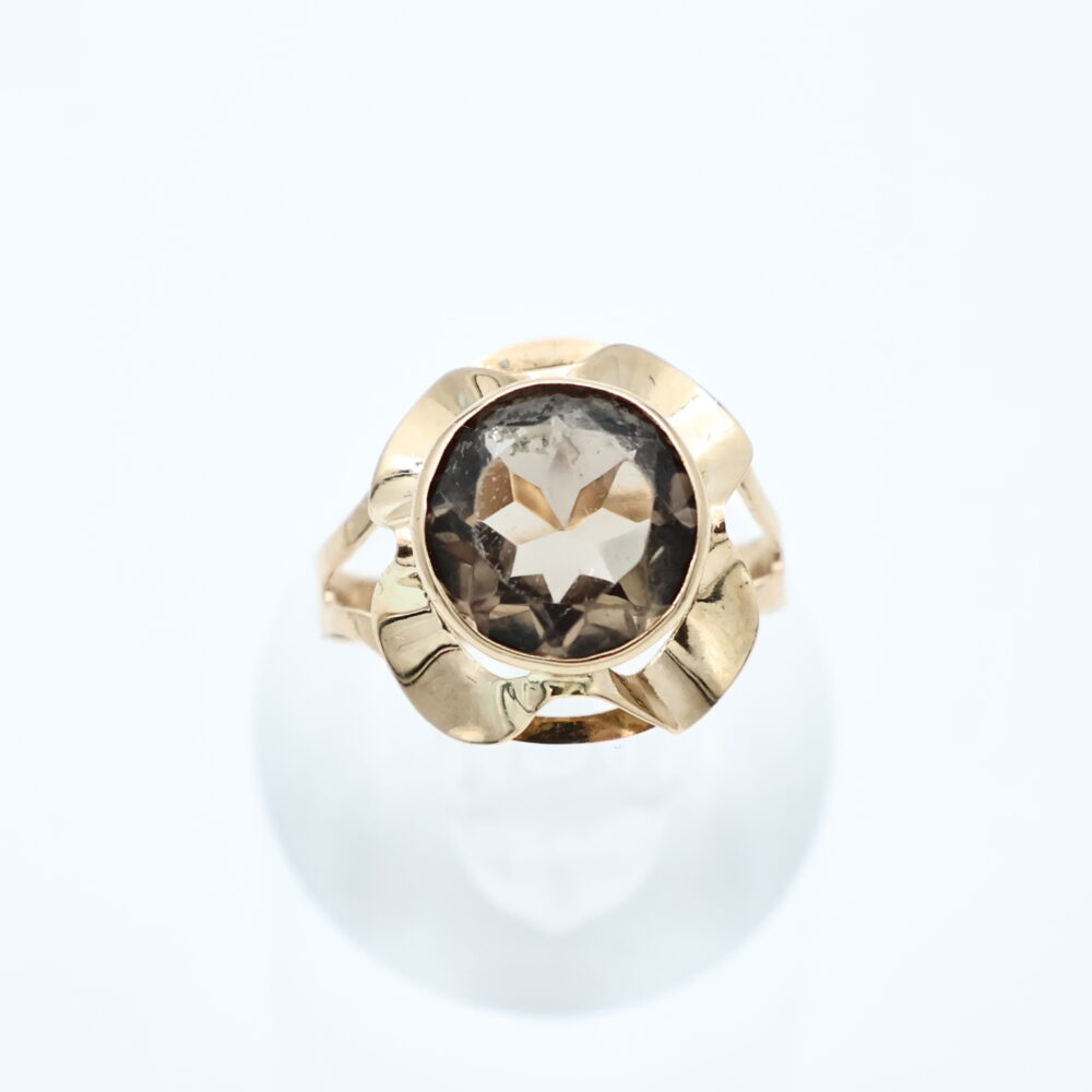 Ring i gult gull med røykkvarts og små diamanter 14kt gult gull største breddemål 20.6mm totalvekt 4.1 gram størrelse 59