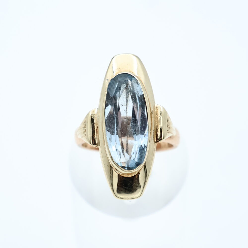 Ring i gult gull med blå sten 14kt gult gull største breddemål 25.3 mm totalvekt 6.1 gram størrelse 53.5