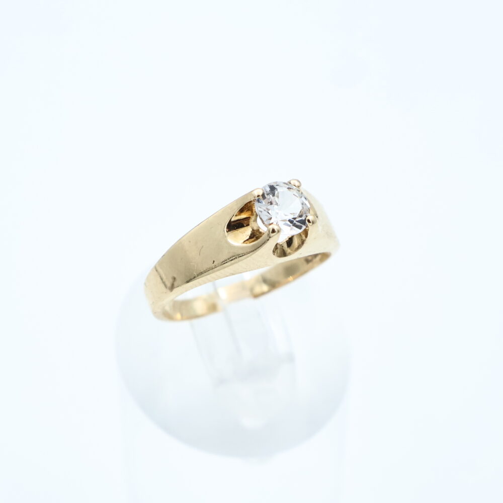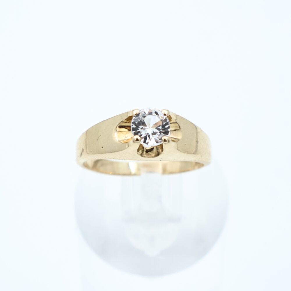 Ring i gult gull med hvit sten 14kt gult gull største breddemål 8.4 mm totalvekt 6.3 gram størrelse 58
