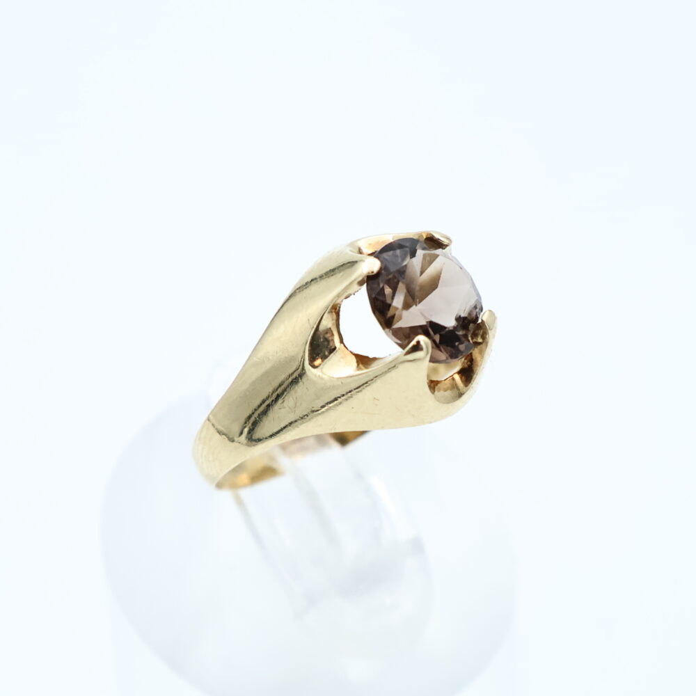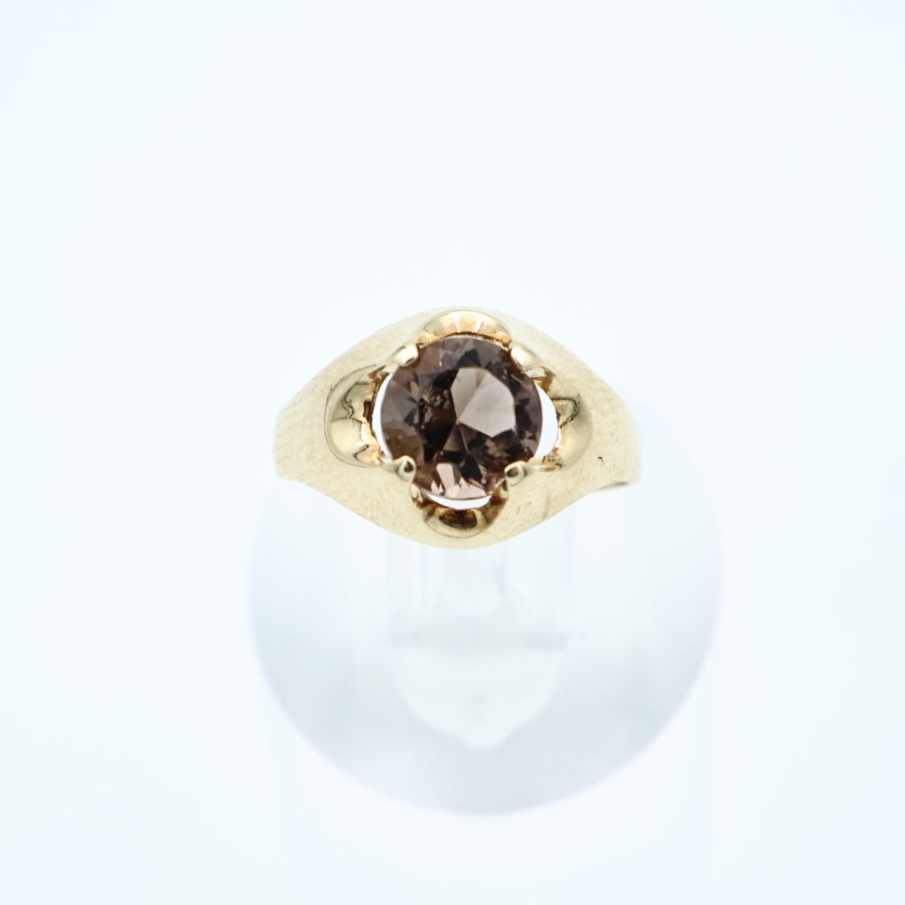 Ring i gult gull med brun sten 14kt gult gull største breddemål 10.9 mm totalvekt 2.4 gram størrelse 51