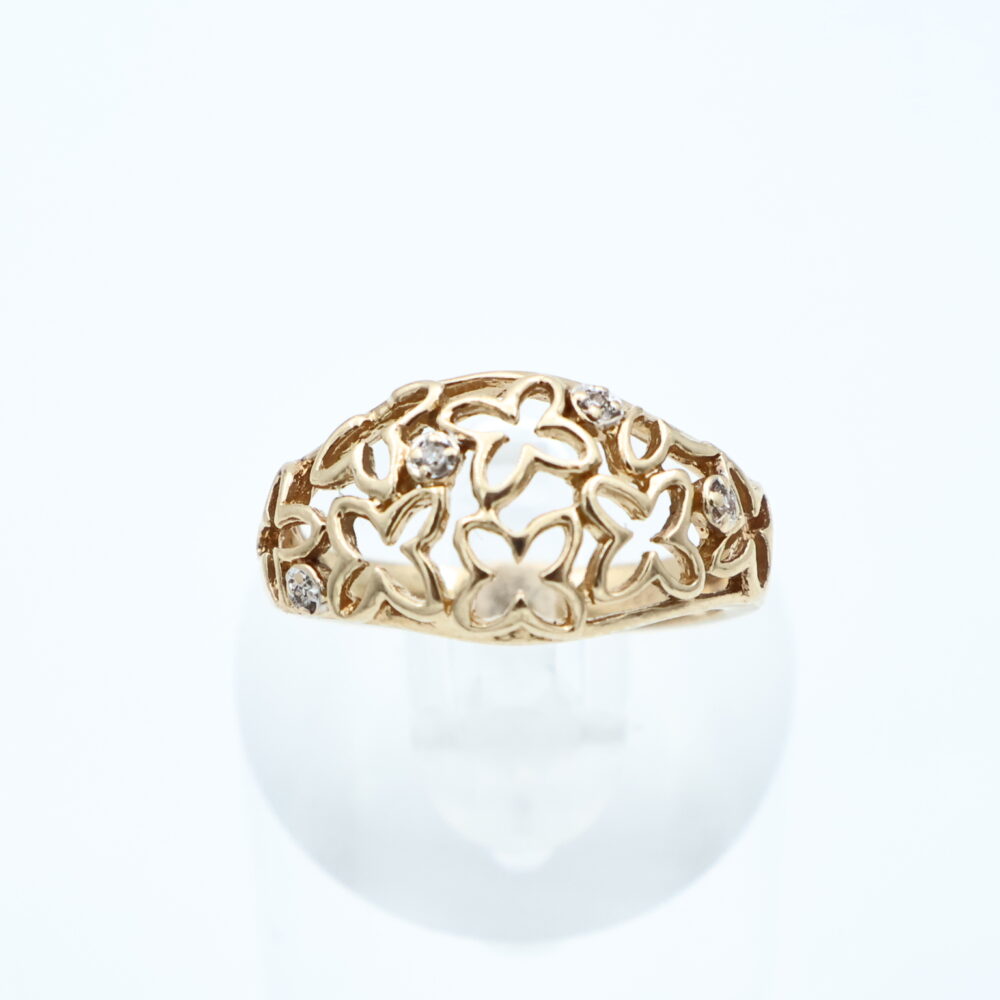 Ring i gult gull med hvit sten 14kt gult gull største breddemål 16.2 mm totalvekt 4.7 gram størrelse 50