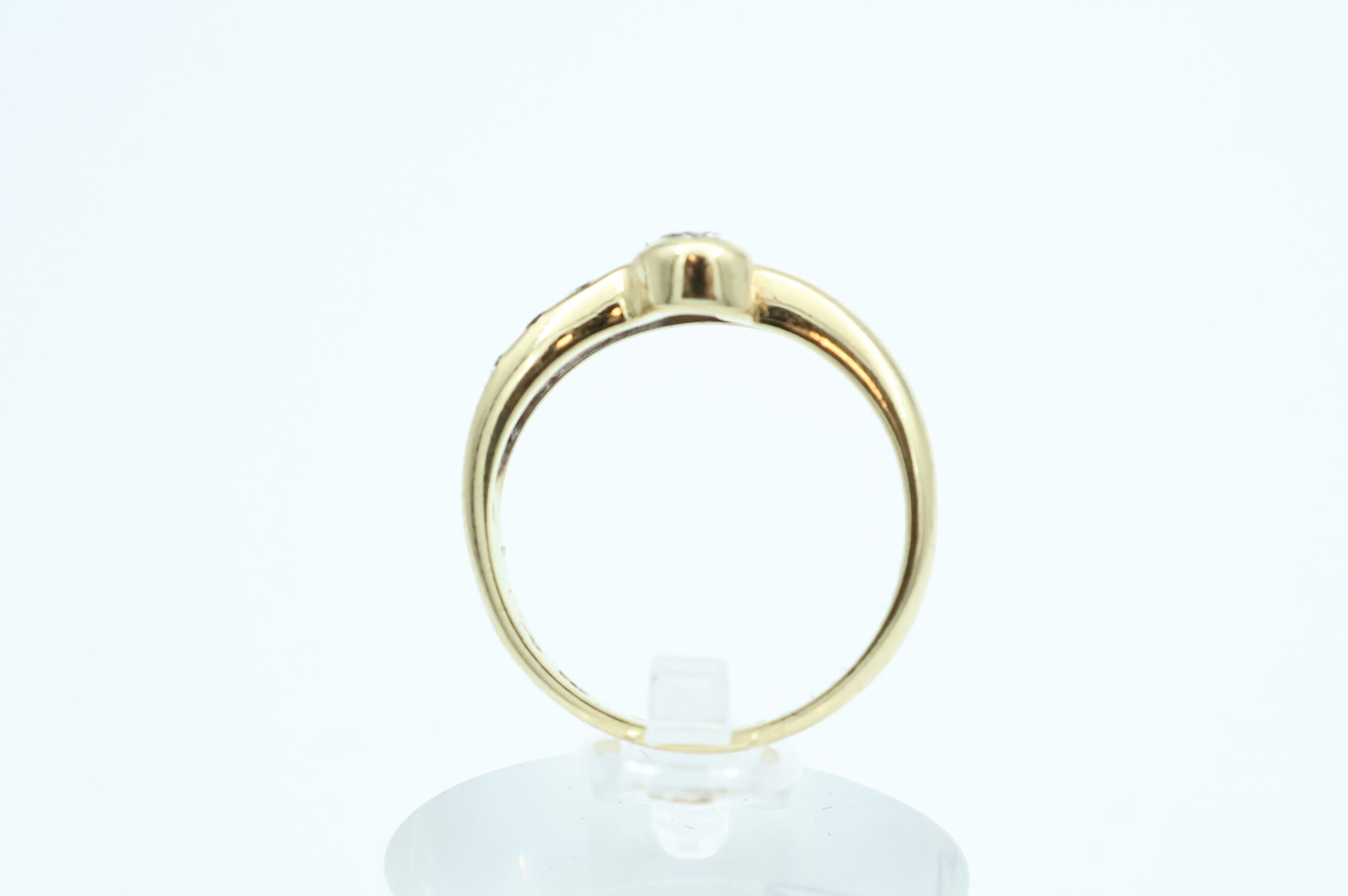 Ring i gult gull med diamanter 14kt gult gull største breddemål 16,61 mm totalvekt 3,09 gram estimert 0.03ct fordelt på