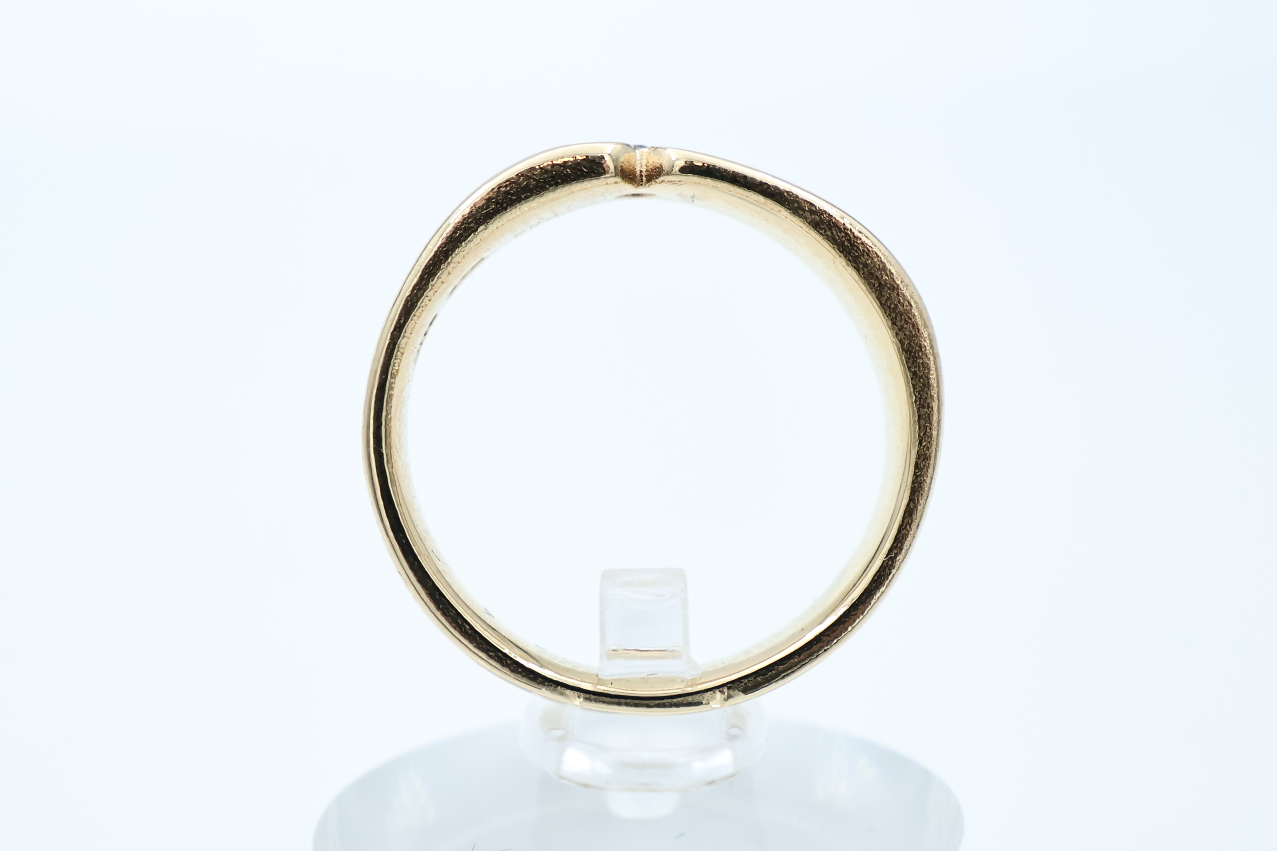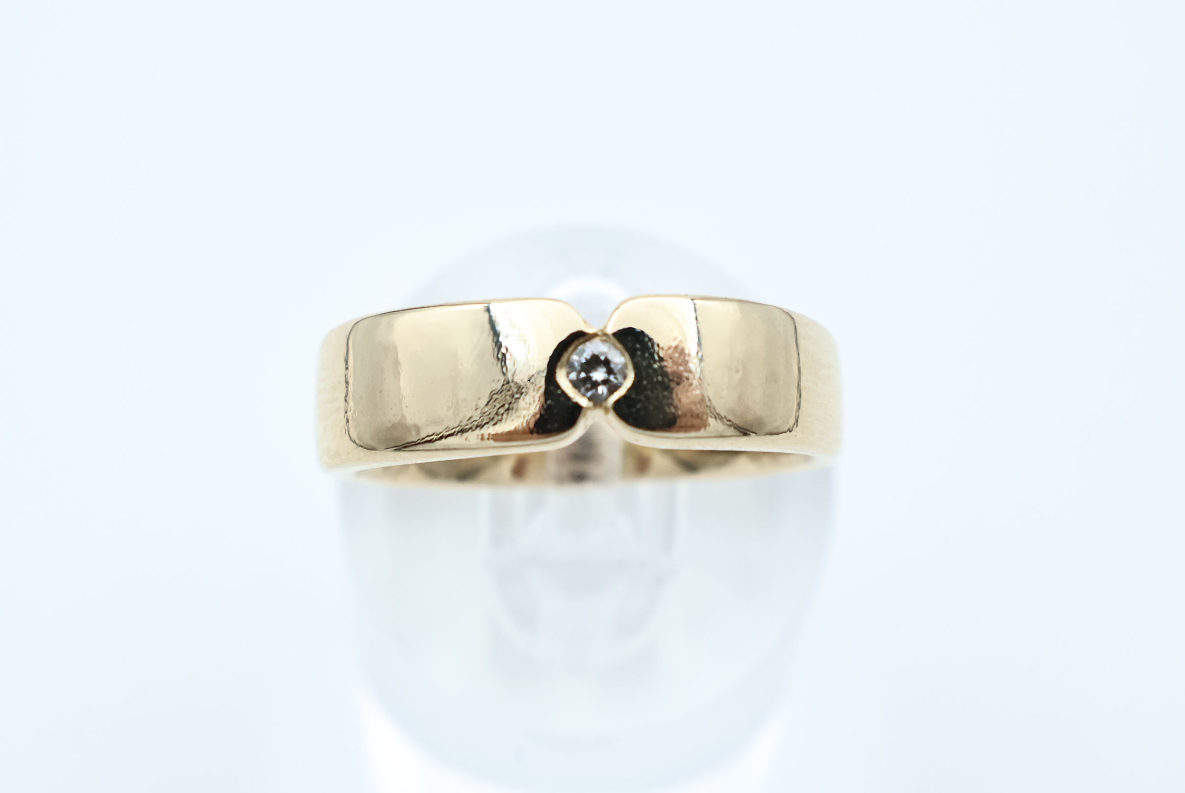 Ring i flerfarget gull med diamant 14kt gult, rødt og hvitt gull største breddemål 6,10 mm totalvekt 3,08 gram estimert