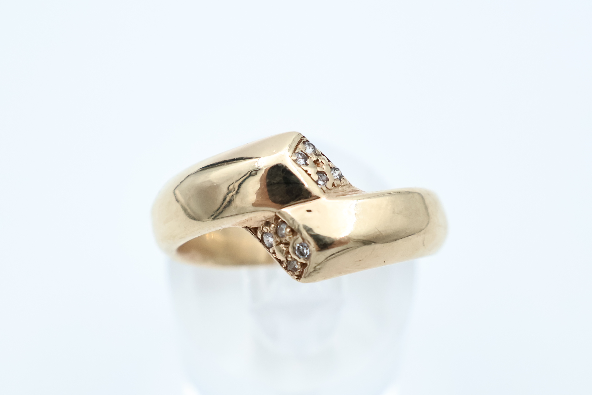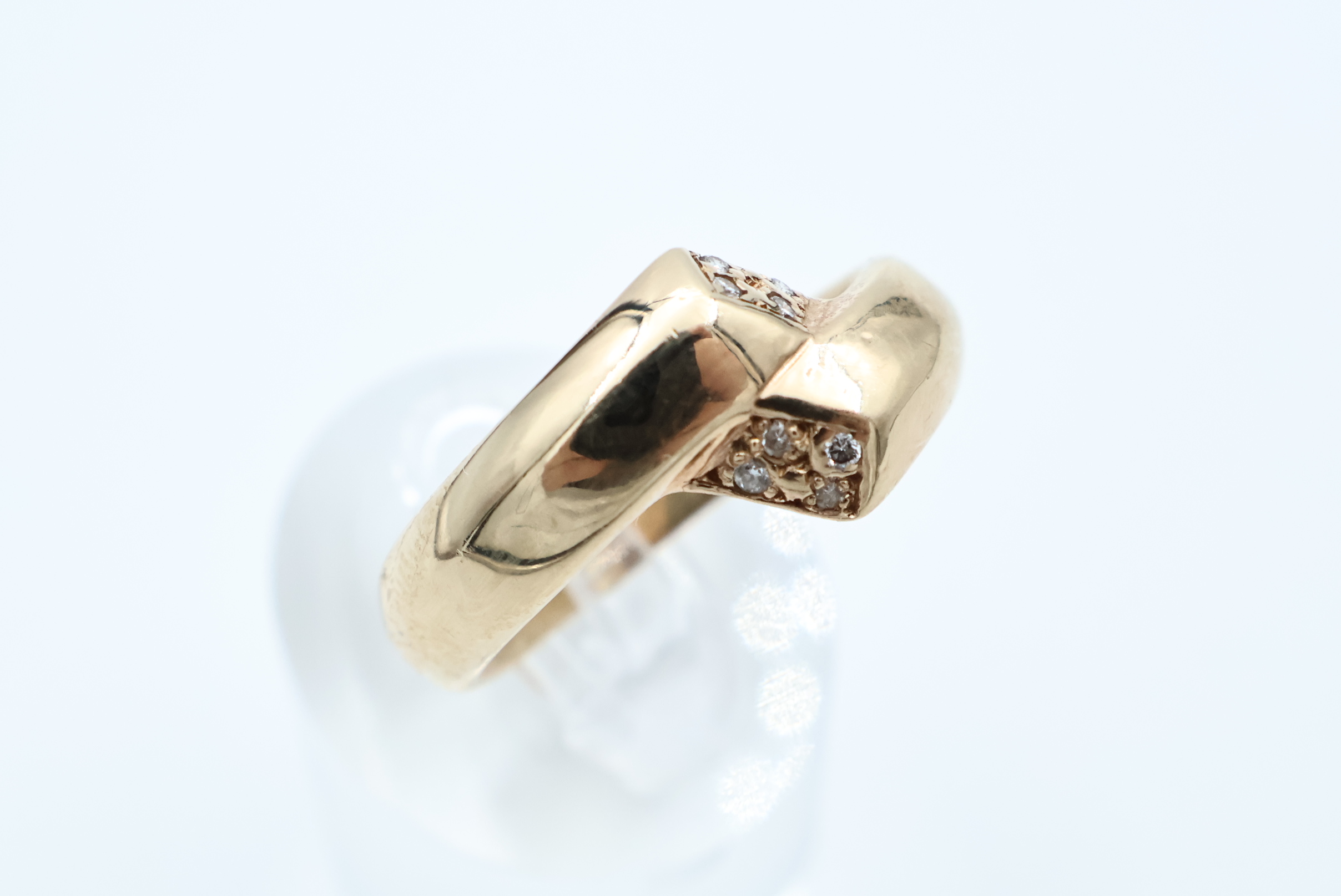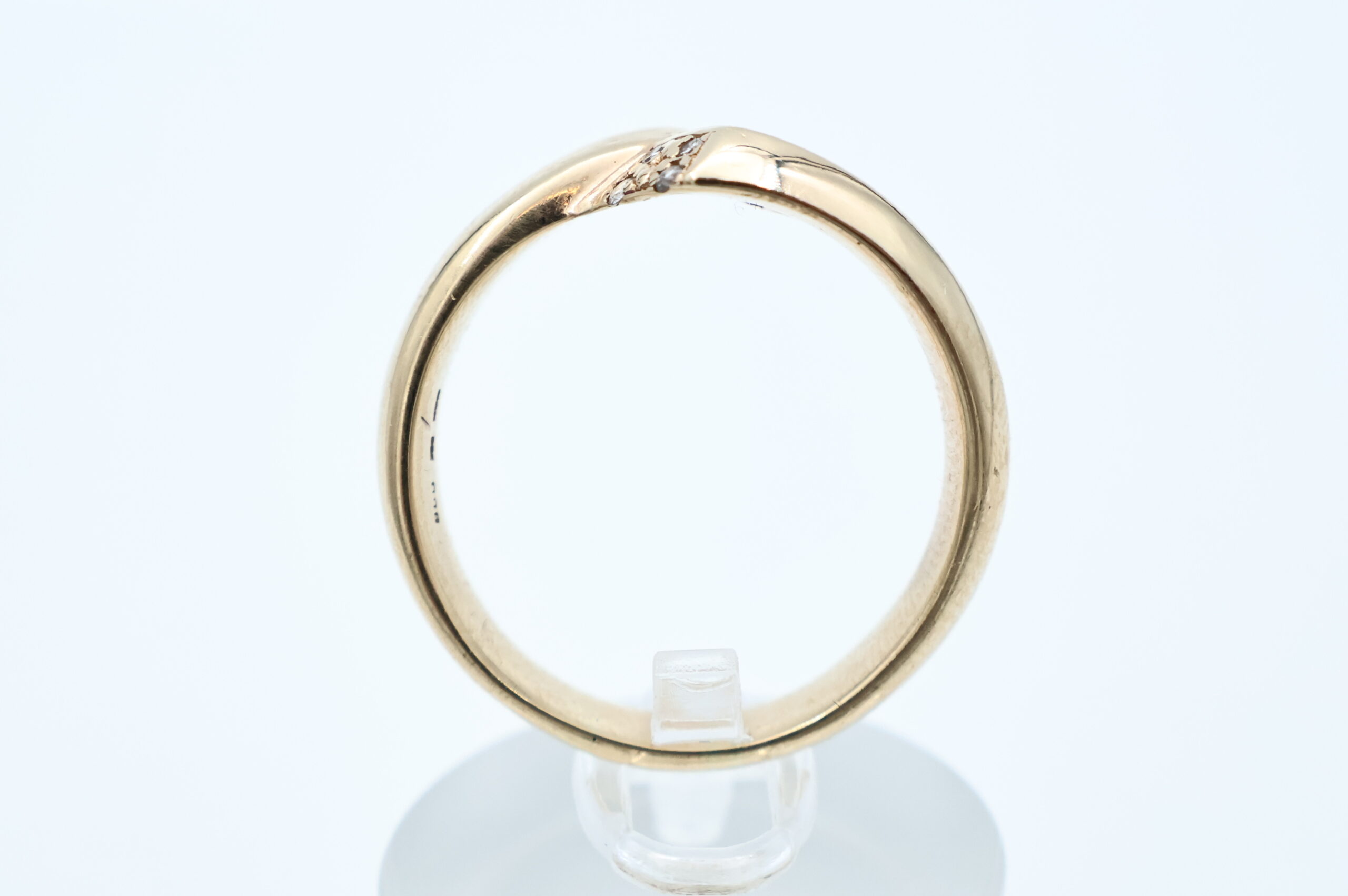 Ring i flerfarget gull med diamant 14kt gult, rødt og hvitt gull største breddemål 6,10 mm totalvekt 3,08 gram estimert