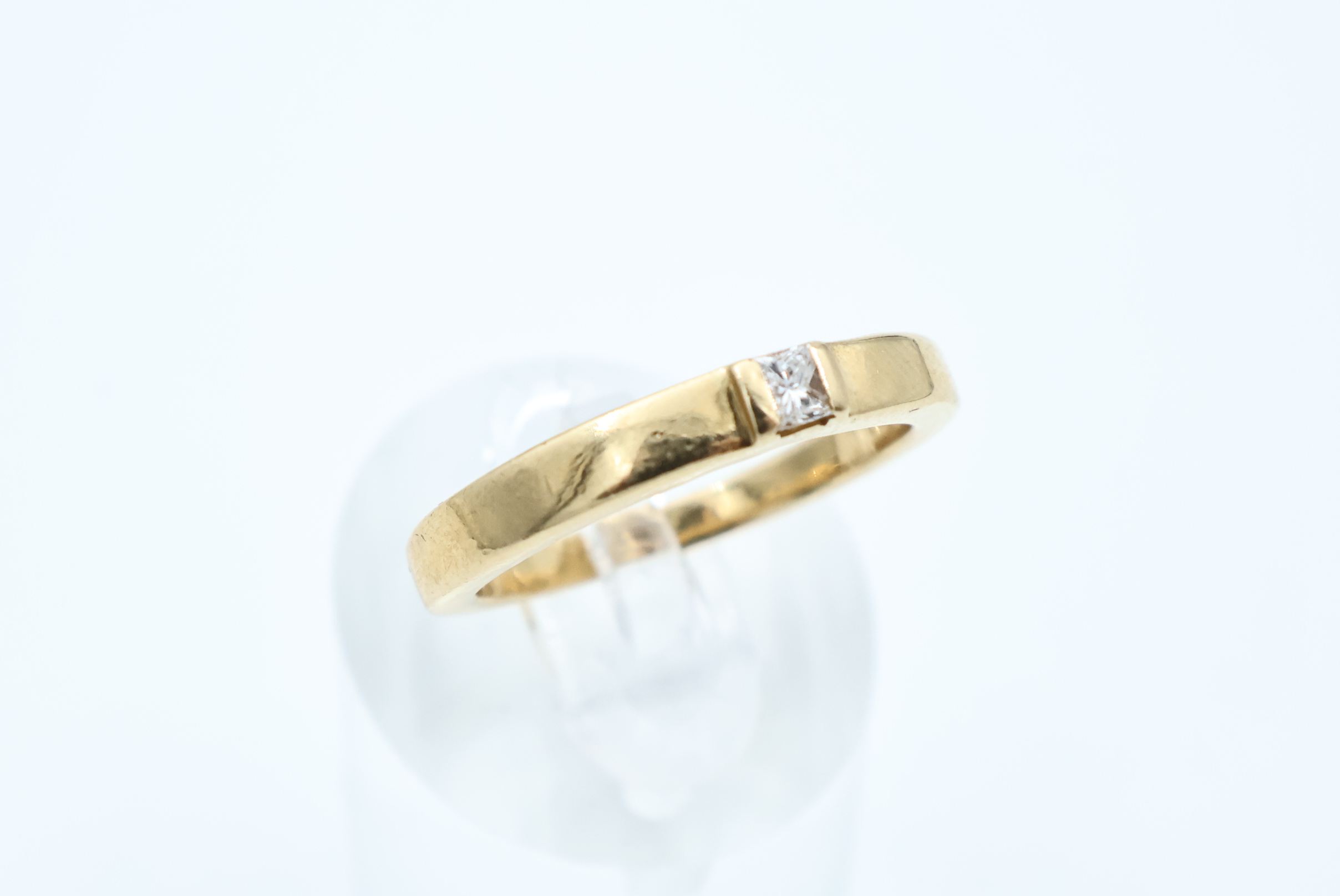 Ring i hvitt gull med diamant 14kt hvitt gull største breddemål 3,70 mm totalvekt 1,9 gram estimert diamantvekt 0.06ct estimert