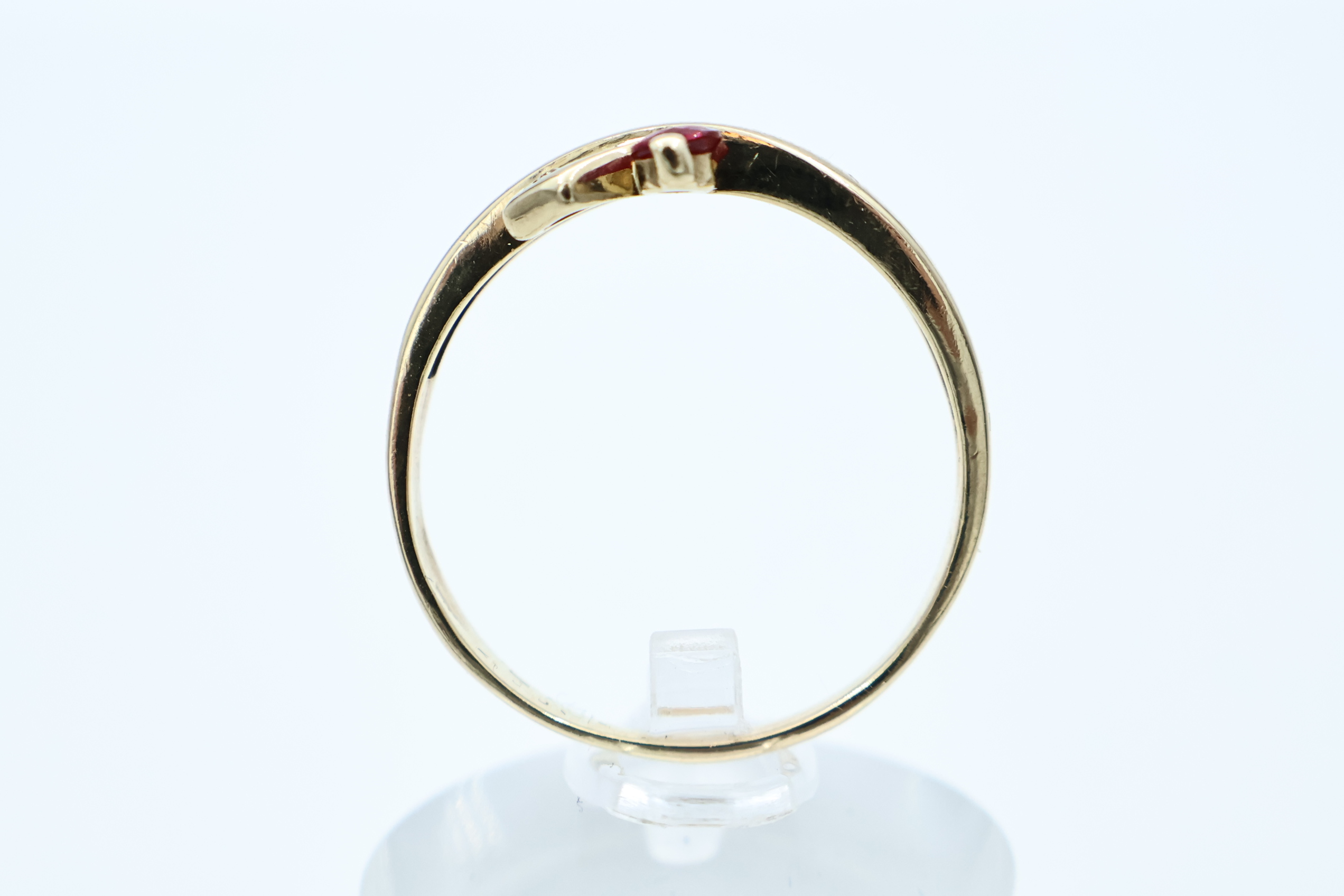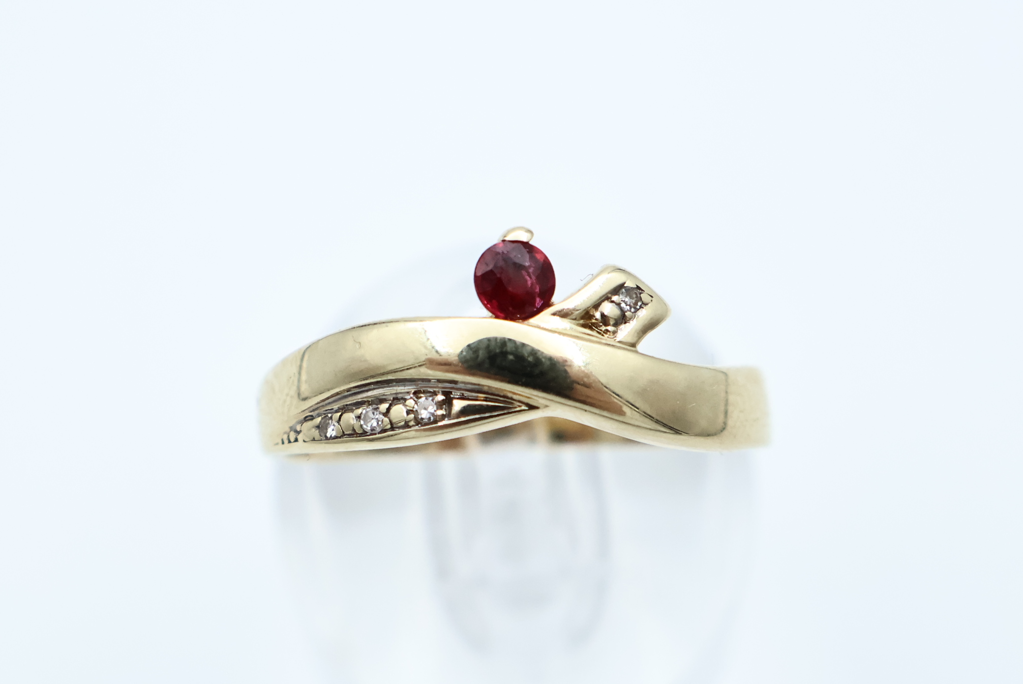 Ring i flerfarget gull med diamant 14kt gult, rødt og hvitt gull største breddemål 6,10 mm totalvekt 3,08 gram estimert