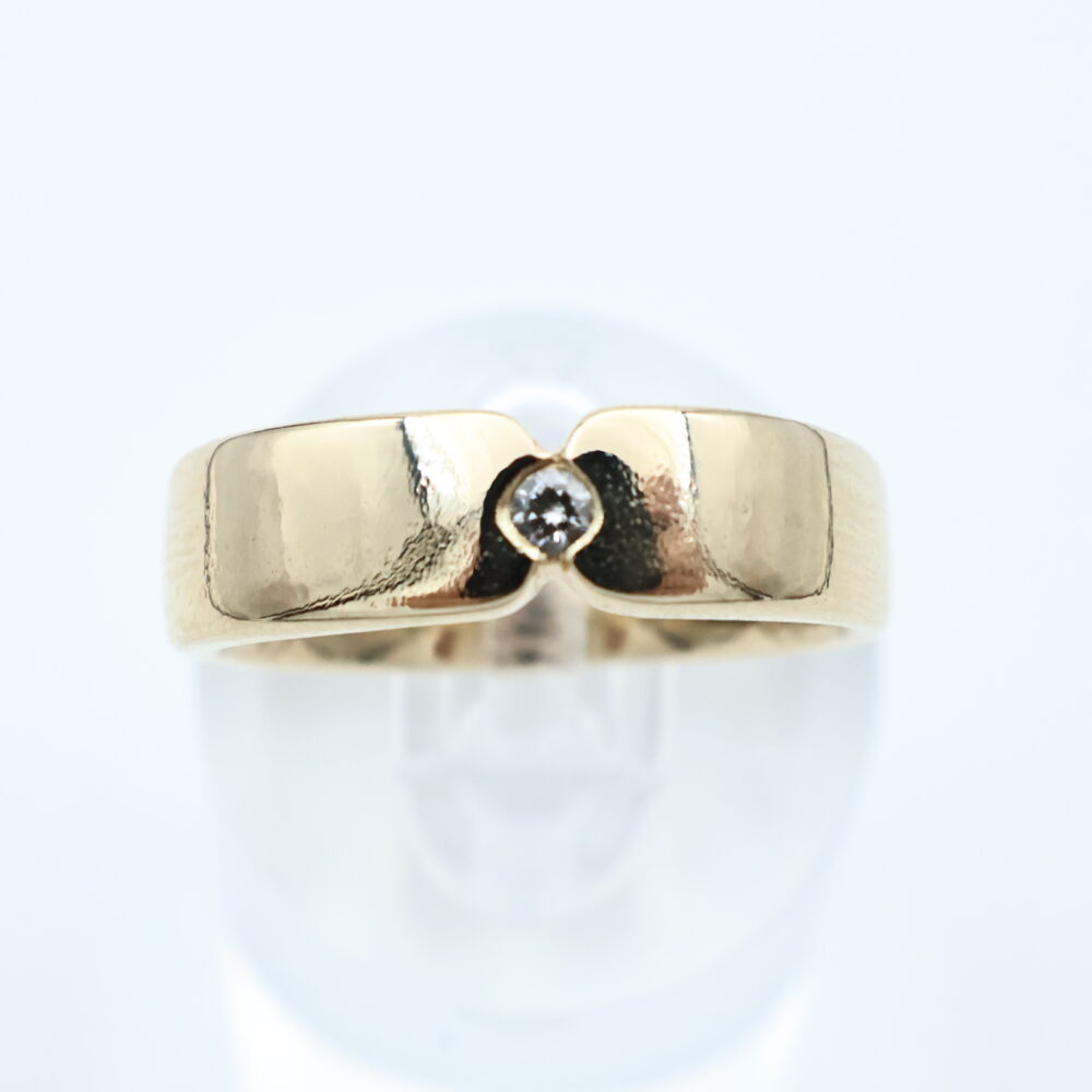 Ring i flerfarget gull med diamant 14kt gult, rødt og hvitt gull største breddemål 6,10 mm totalvekt 3,08 gram estimert