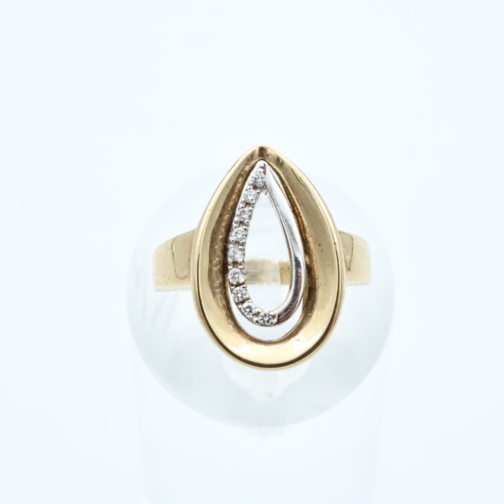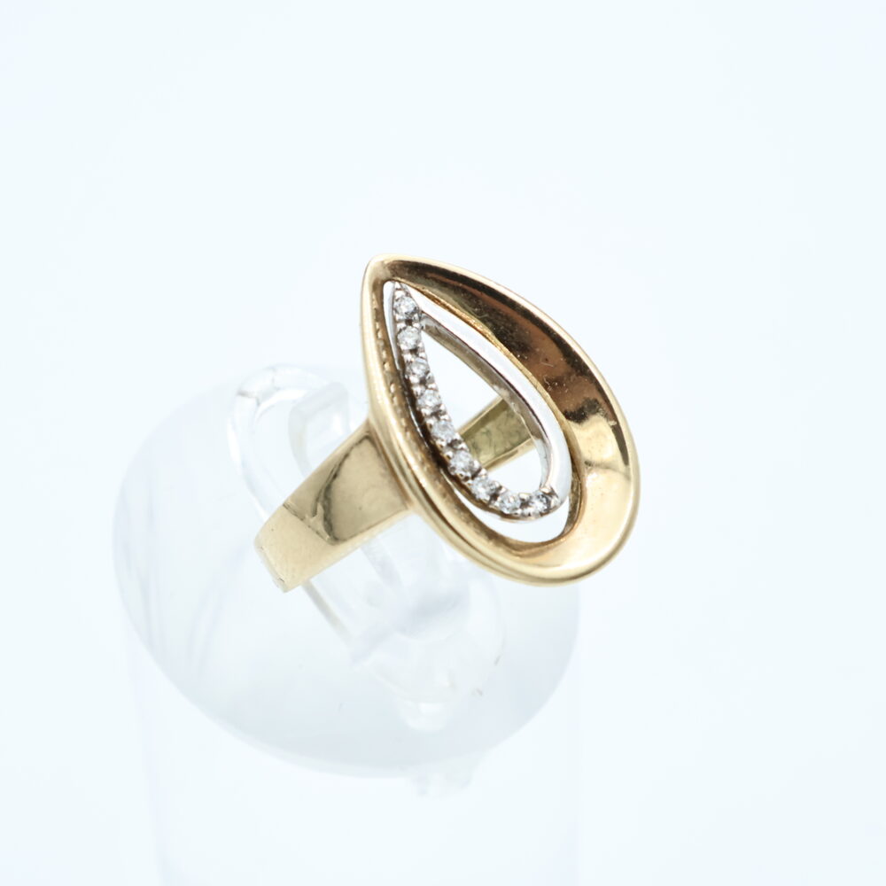 Ring i flerfarget gull med diamant 14kt gult, rødt og hvitt gull største breddemål 6,10 mm totalvekt 3,08 gram estimert