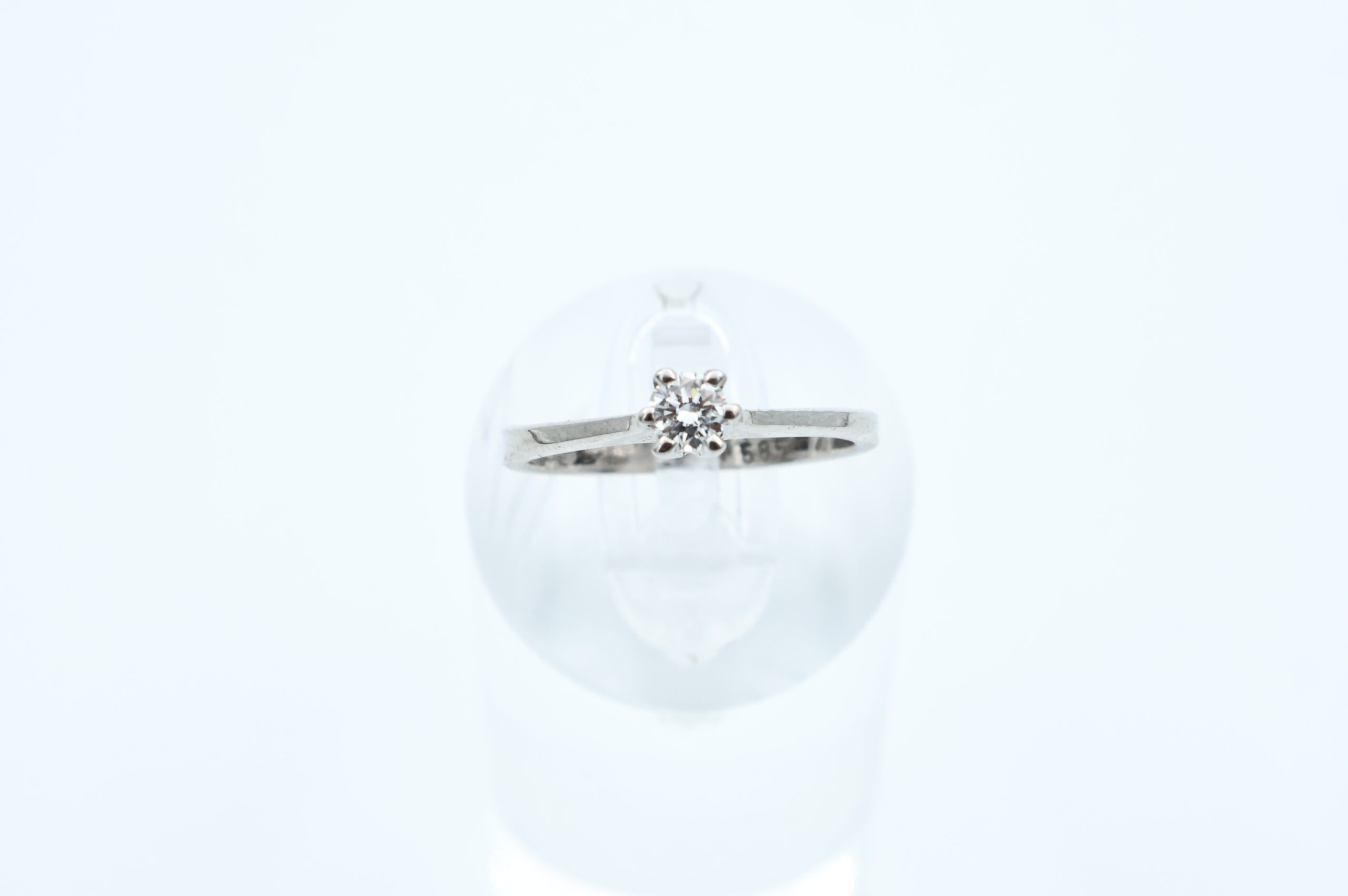 Ring i hvitt gull med diamanter 14kt hvitt gull største breddemål 2,52 mm totalvekt 1,73 gram estimert 0,18ct fordelt på