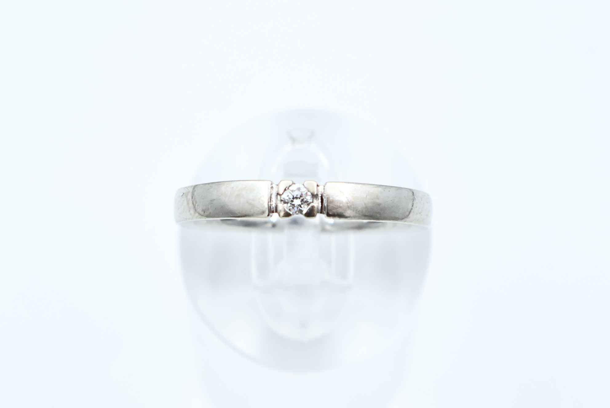 Ring i hvitt gull med diamanter fattet i skinne 18kt hvitt gull største breddemål 3,8 mm totalvekt 3,1 gram estimert