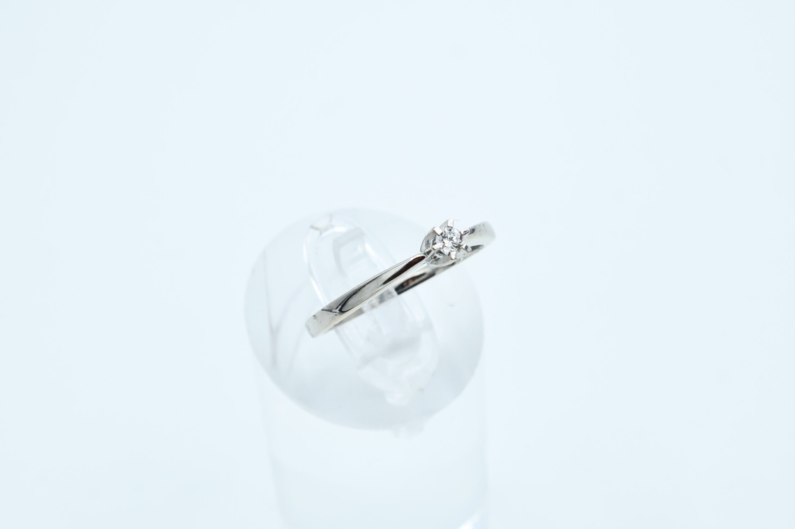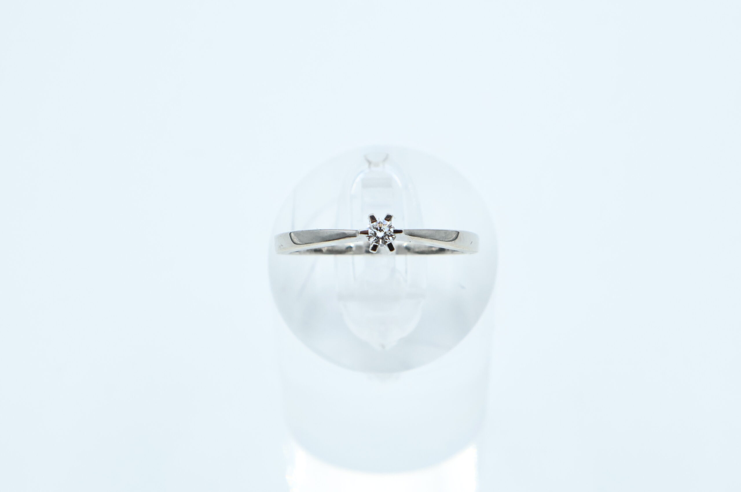 Ring i hvitt gull med diamant 14kt hvitt gull største breddemål 3,70 mm totalvekt 1,9 gram estimert diamantvekt 0.06ct estimert