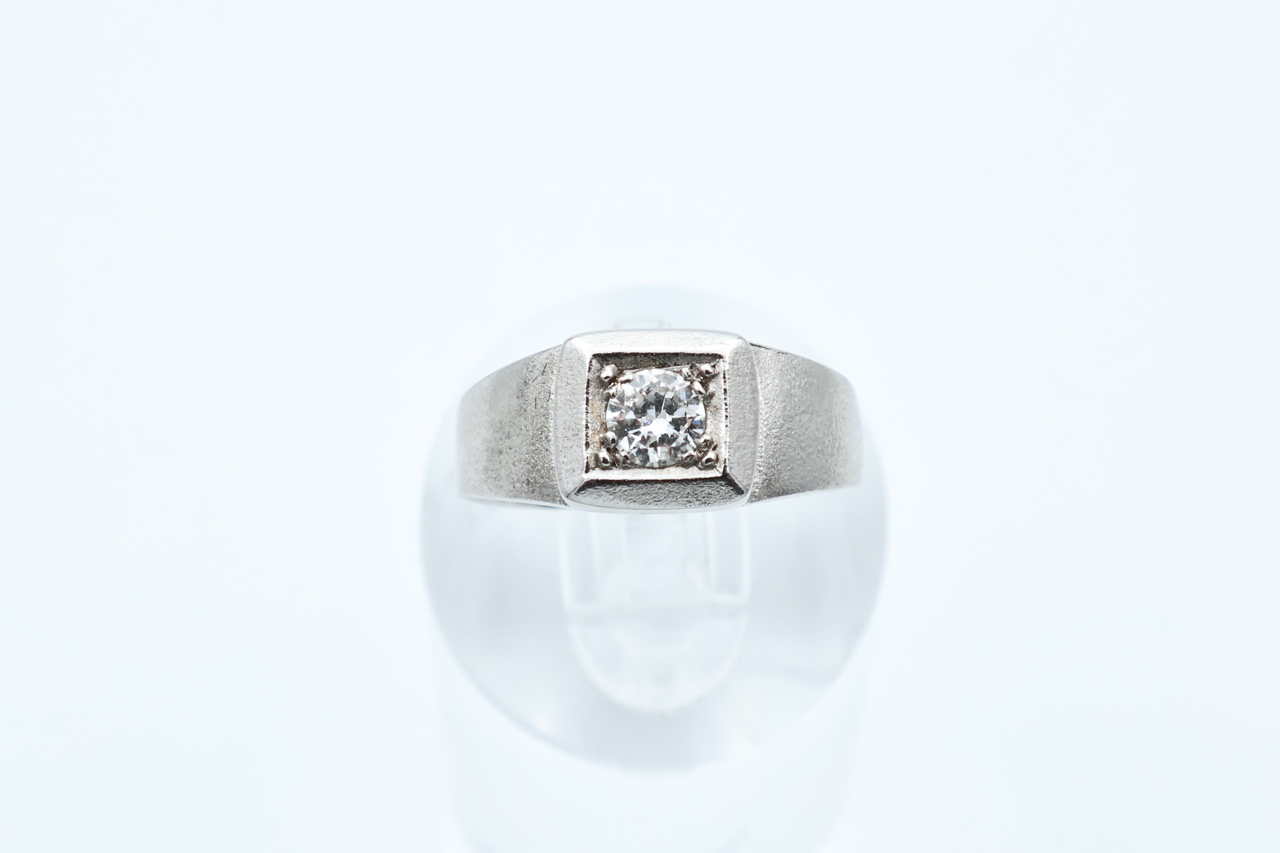 Ring i hvitt gull med diamant 14kt hvitt gull største breddemål 3,70 mm totalvekt 1,9 gram estimert diamantvekt 0.06ct estimert
