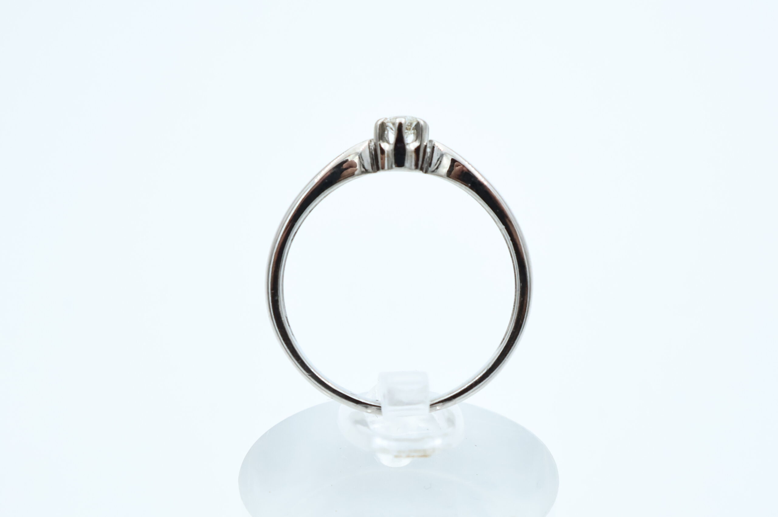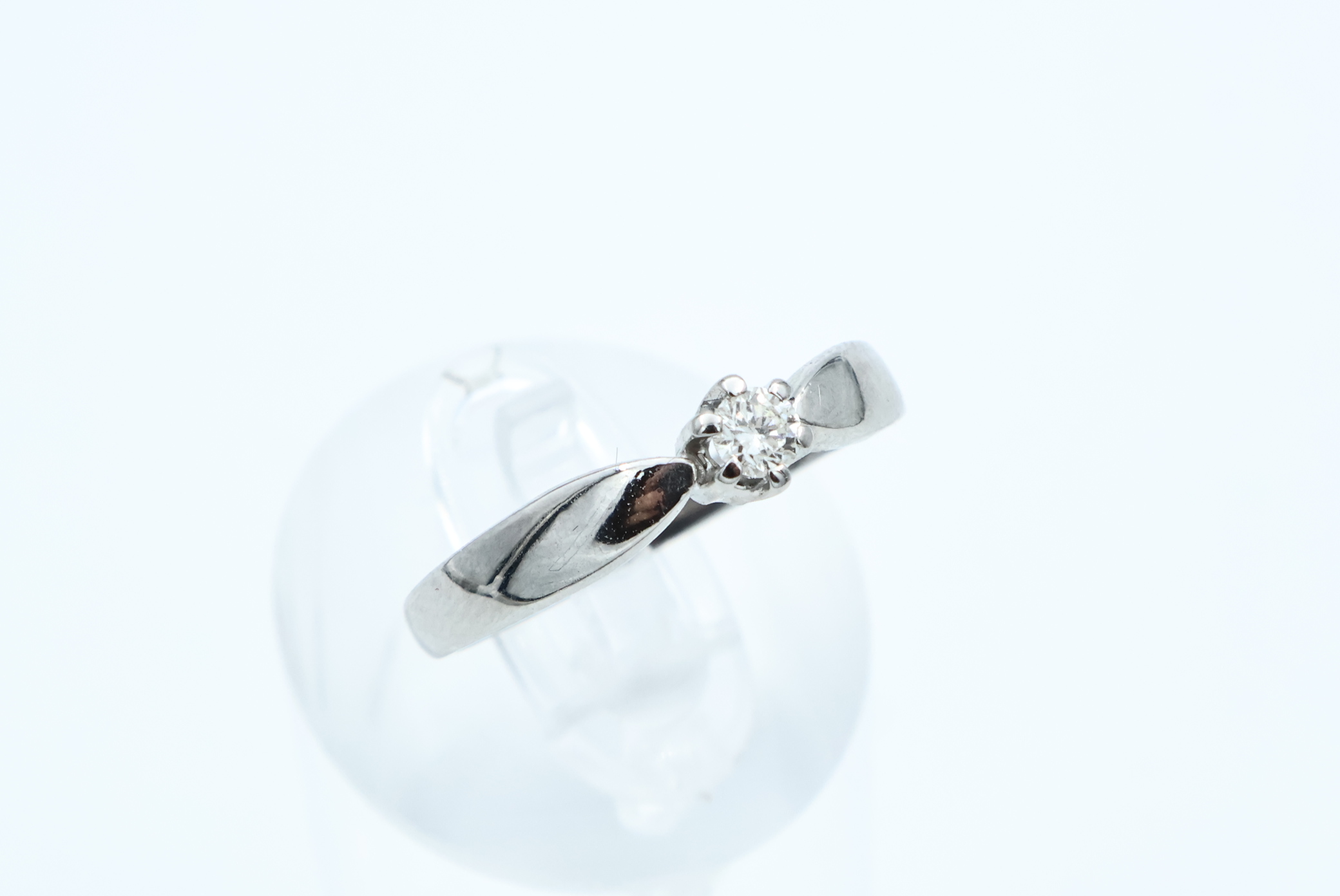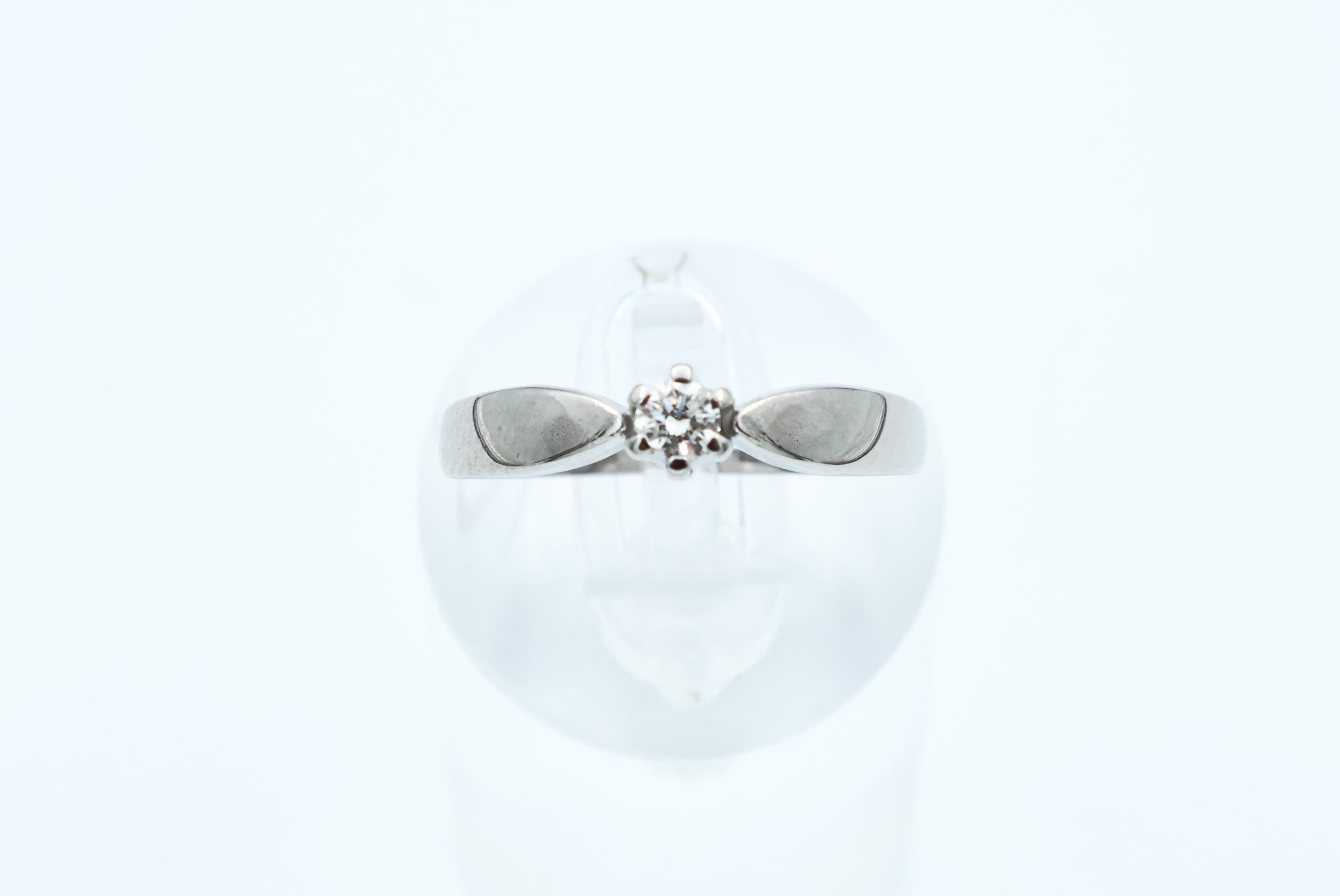 Ring i hvitt gull med diamant 14kt hvitt gull største breddemål 3,70 mm totalvekt 1,9 gram estimert diamantvekt 0.06ct estimert