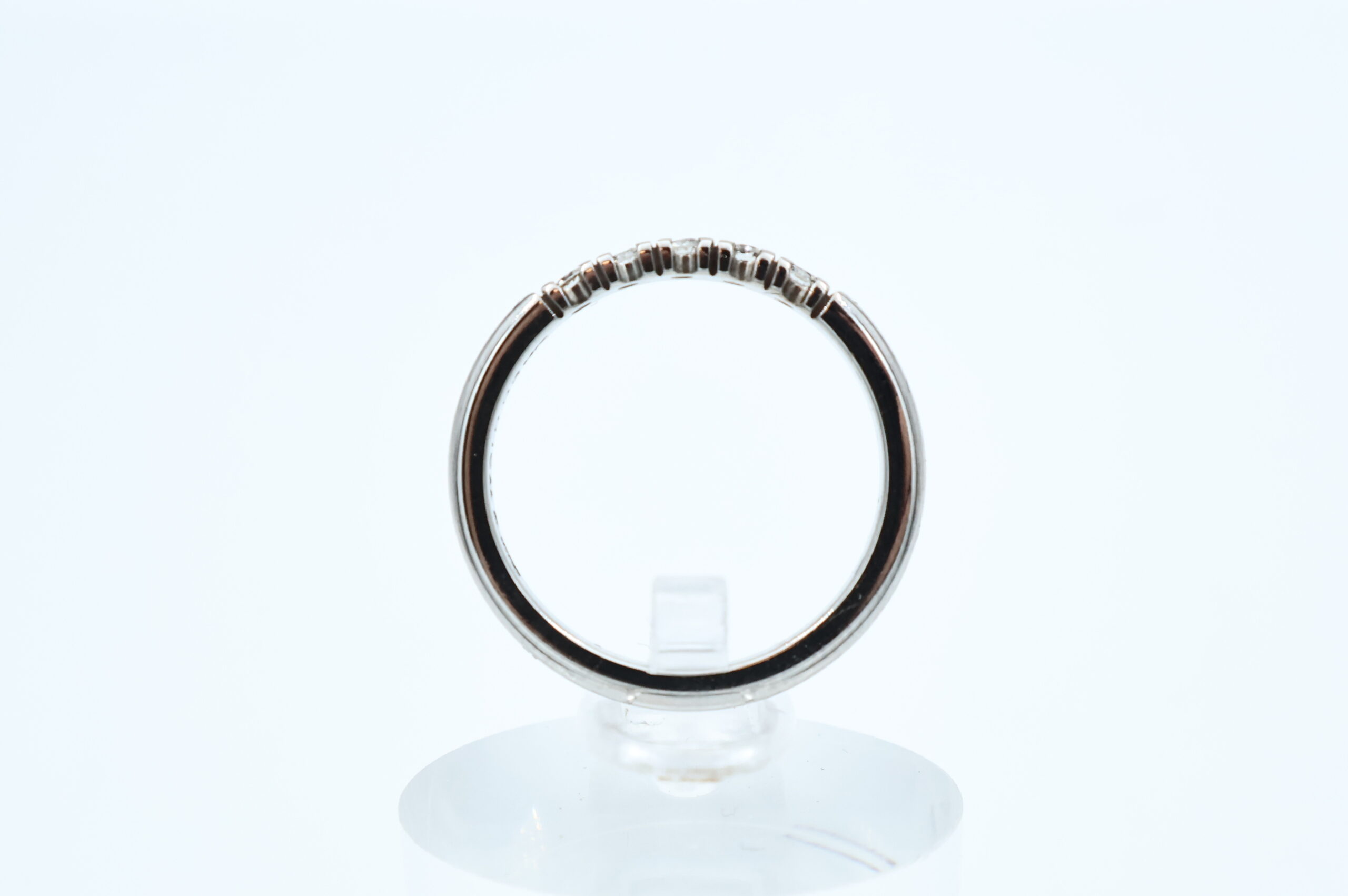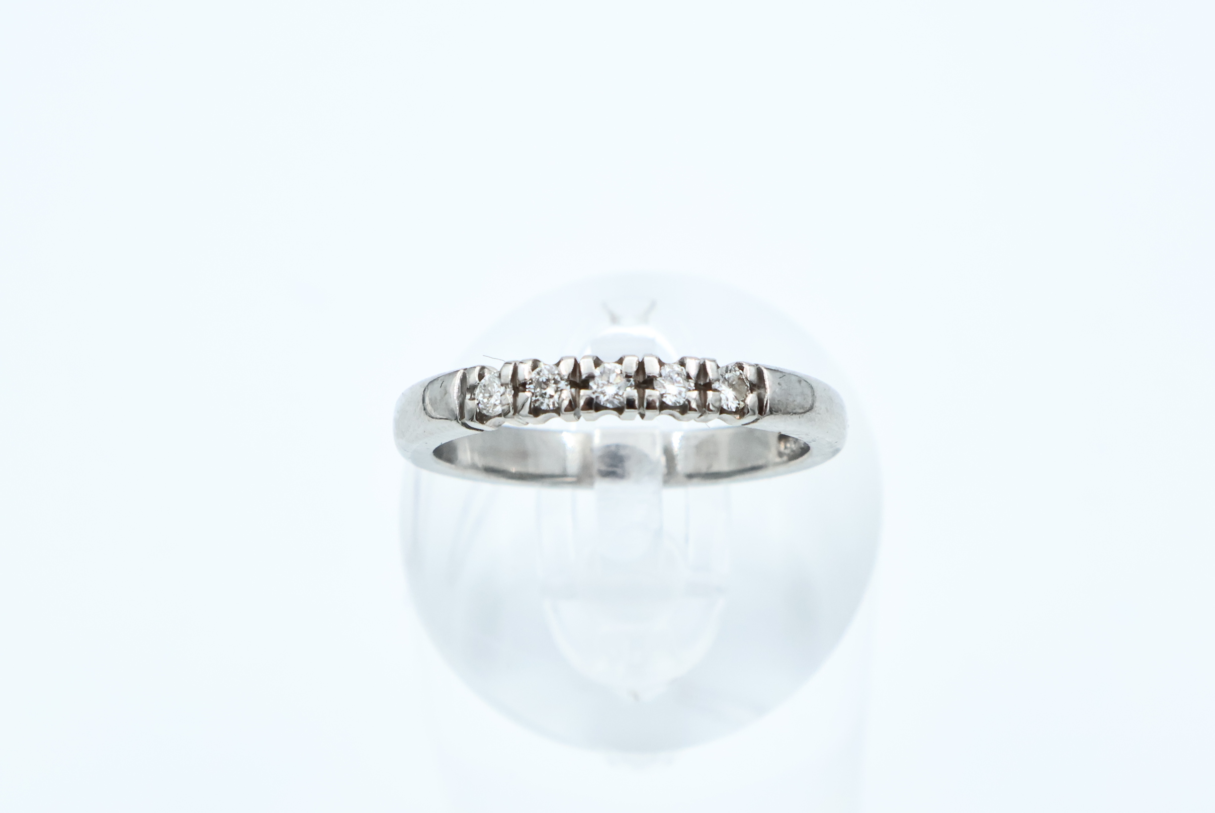 Ring i hvitt gull med diamanter 14kt hvitt gull, syretestet største breddemål 7,0 mm totalvekt 2,7 gram estimert 0.27ct fordelt