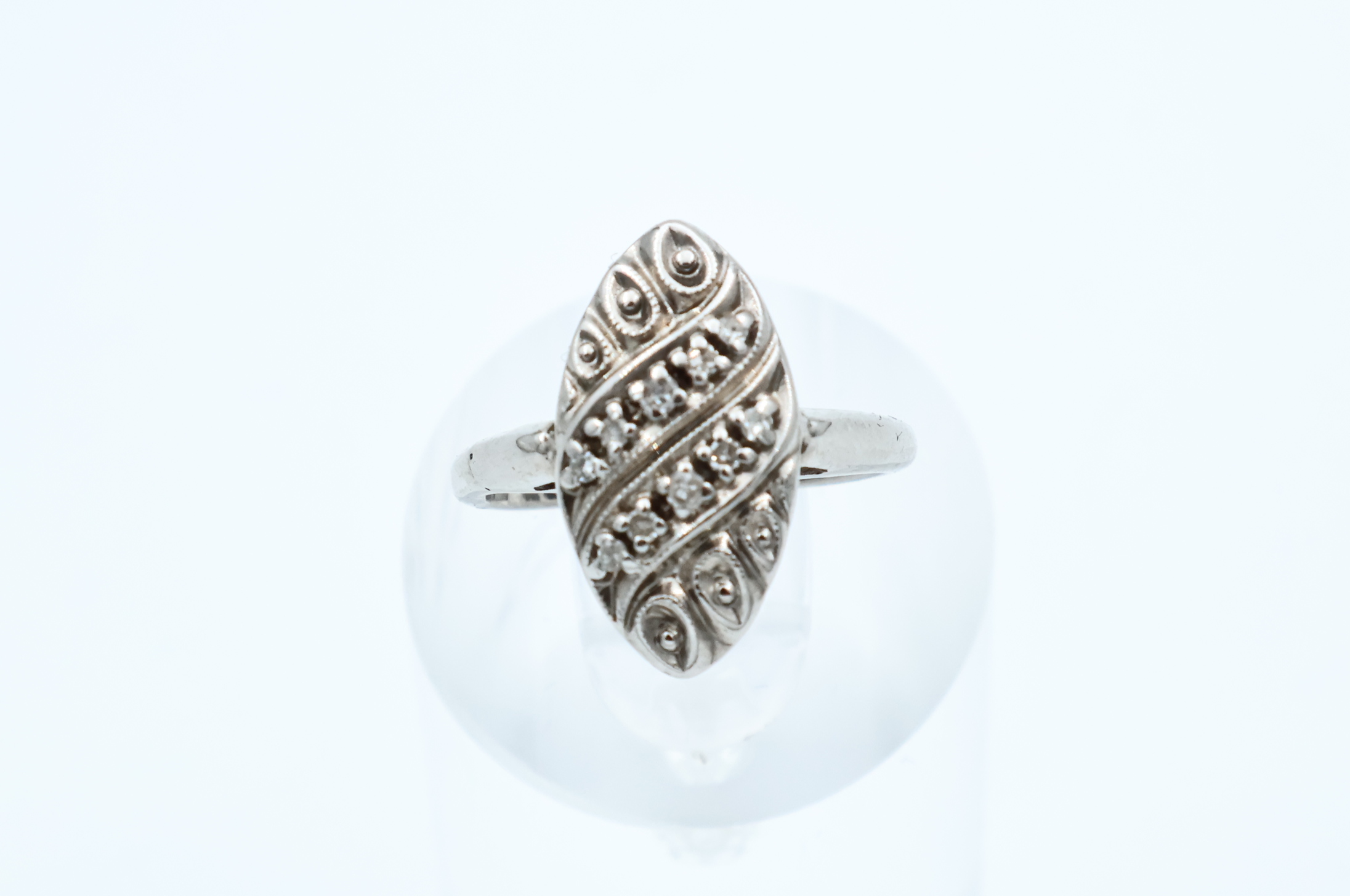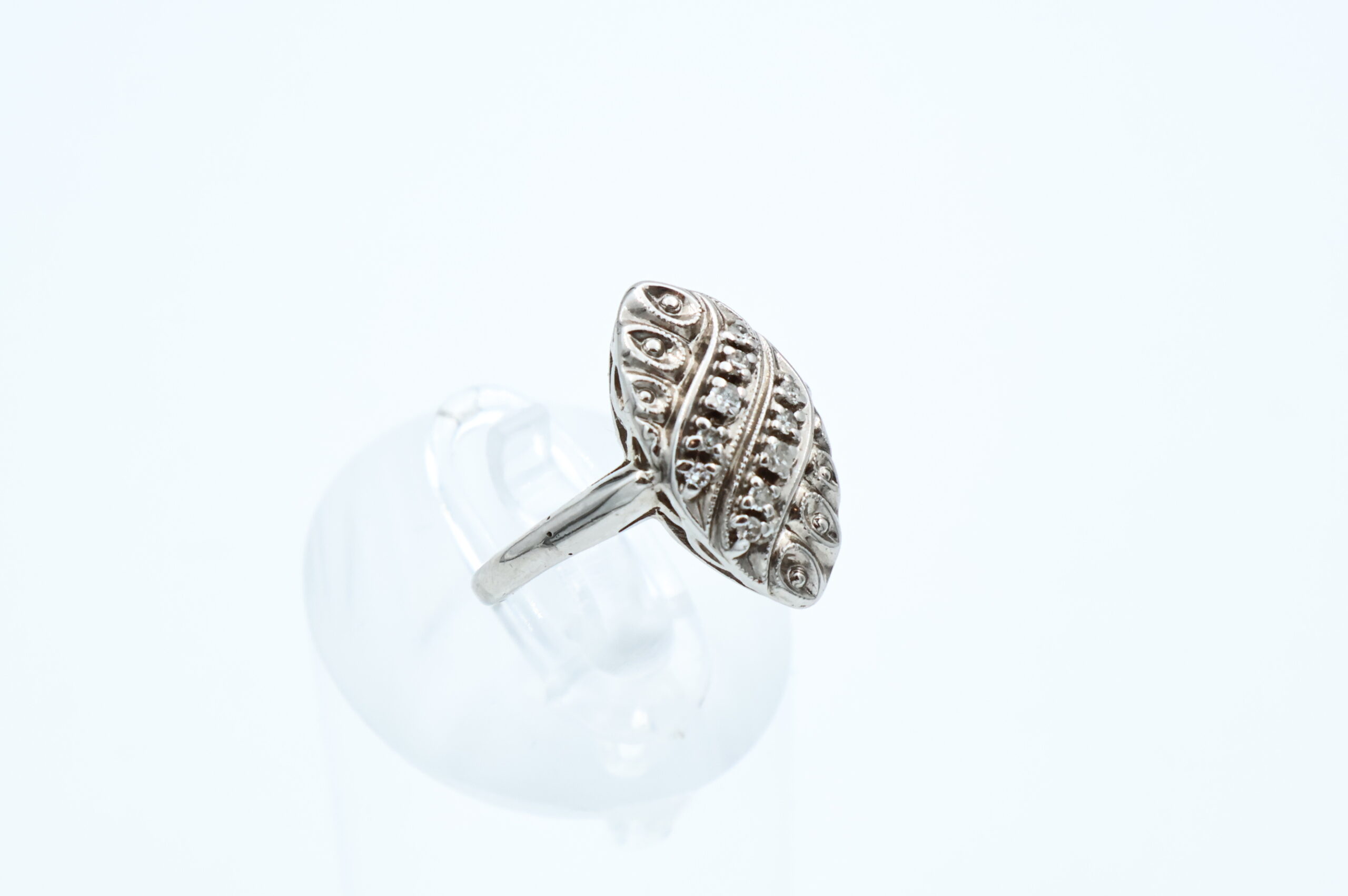 Ring i hvitt gull med diamanter 14kt hvitt gull Ivar T. Holth AS, Oslo største breddemål 14,4 mm totalvekt 2,9